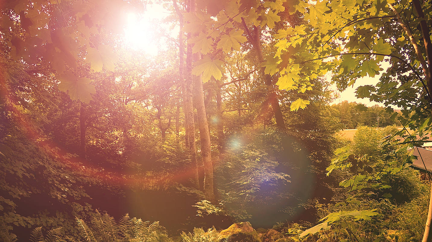 En en röd-orange strålvy genom dansande trädkronor döljer delvis vad som tillfälligt fortfarande är ett väntande framtida hem som ska byggas nedanför. Jag ser redan allt liv där borta och hur vackert allt kan bli, glimrandes genom ångorna från den kopp jag håller. Den är nog den enda koppen i världen med tevatten kokad på ström uppdragen ur jorden och lagrad – först i stora pulskondensatorsteg och sedan i lastbilsbatterier.